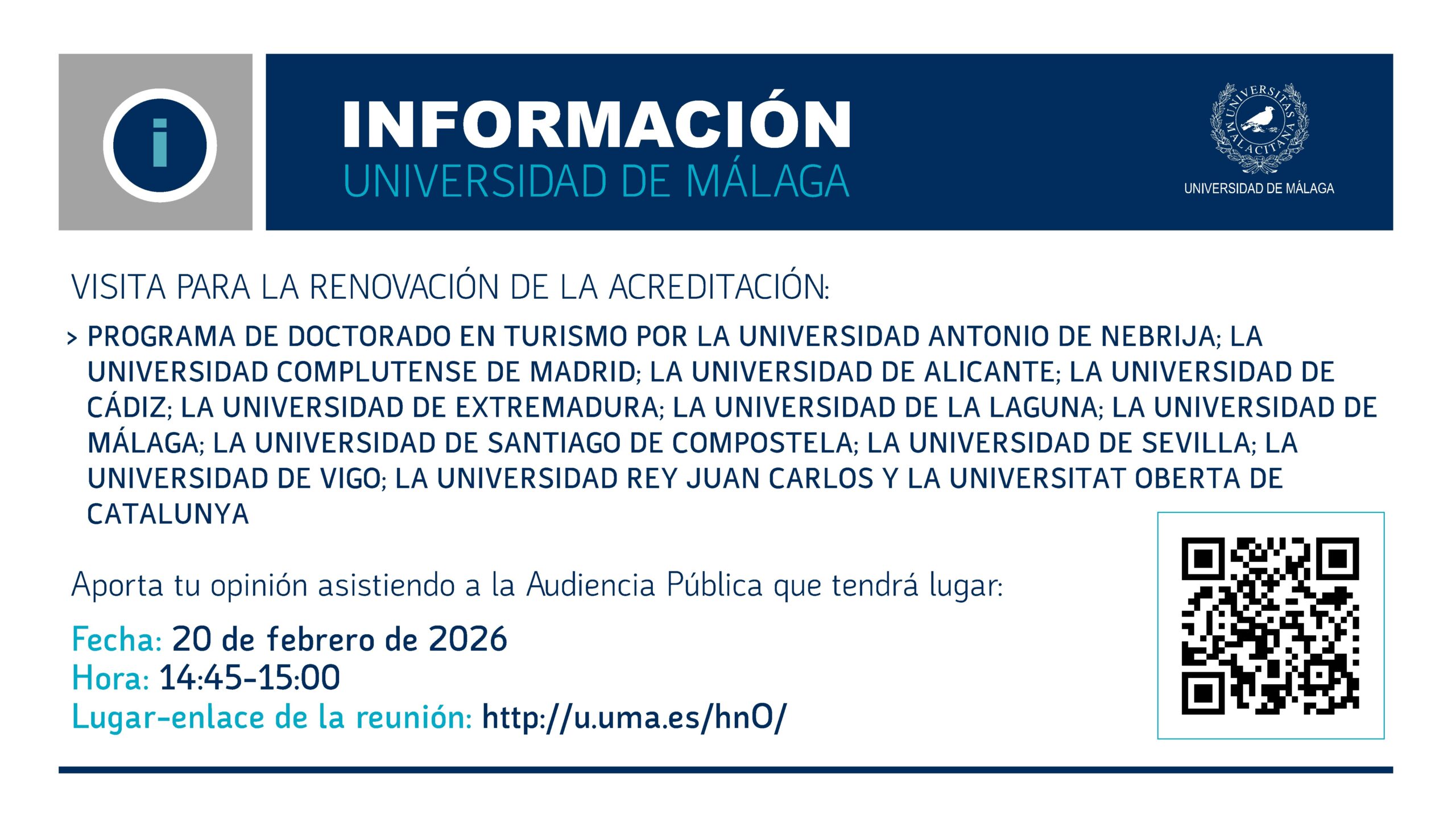 - Denominación específica: Programa de Doctorado en Turismo por la Universidad Antonio de Nebrija; la Universidad Complutense de Madrid; la Universidad de Alicante; la Universidad de Cádiz; la Universidad de Extremadura; la Universidad de La Laguna; la Universidad de Málaga; la Universidad de Santiago de Compostela; la Universidad de Sevilla; la Universidad de Vigo; la Universidad Rey Juan Carlos y la Universitat Oberta de Catalunya.